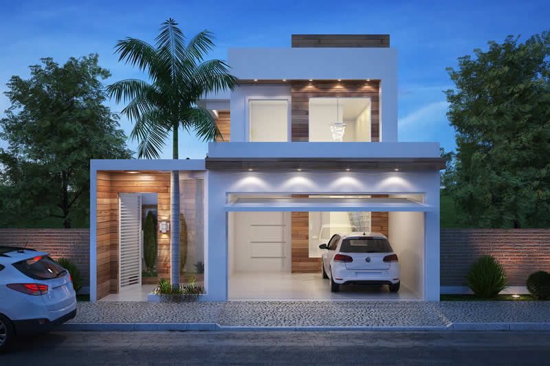 Apresentamos mais um belo sobrado com fachada em vidro e madeira. Com garagem para dois carros, essa planta conta com sala de tv integrada a sala de jantar e cozinha, que ficam próximas da lavanderia e varanda gourmet. Ainda no pavimento térreo tivemos o cuidado de adicionar um quarto para quem prefere evitar subir a escada diariamente. Em cima temos mais duas suítes com sacada sendo uma delas com closet.
