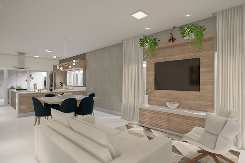 A circulação interna leva à ampla sala de TV, que está integrada à sala de jantar, criando um espaço contínuo e convidativo. A cozinha, moderna e funcional, está ao lado da área gourmet externa, equipada com churrasqueira, proporcionando uma área ideal para receber convidados e realizar eventos. A lavanderia, posicionada próxima à área gourmet, é de fácil acesso e bem ventilada.
